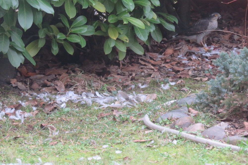 Dans la maison en passant devant la baie vitrée donnant sur le jardin et les mangeoires j'ai été intrigué par une grande tache faite d'un éparpillement de choses blanches. En regardant plus attentivement j'ai vu que c'était des plumes.