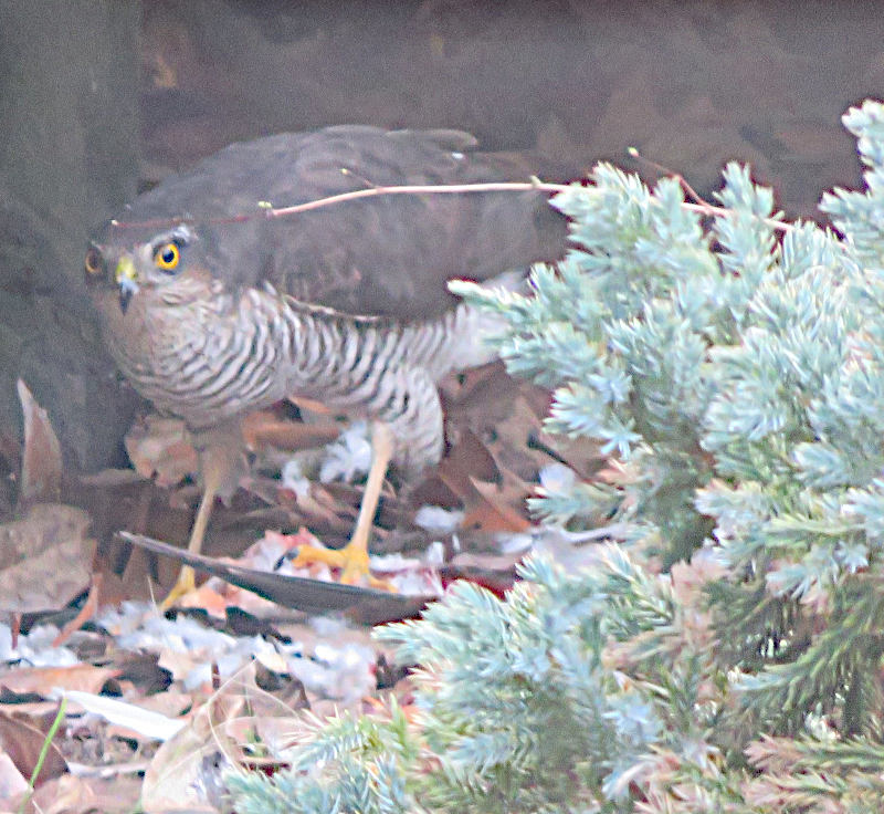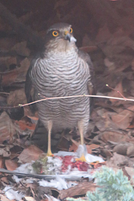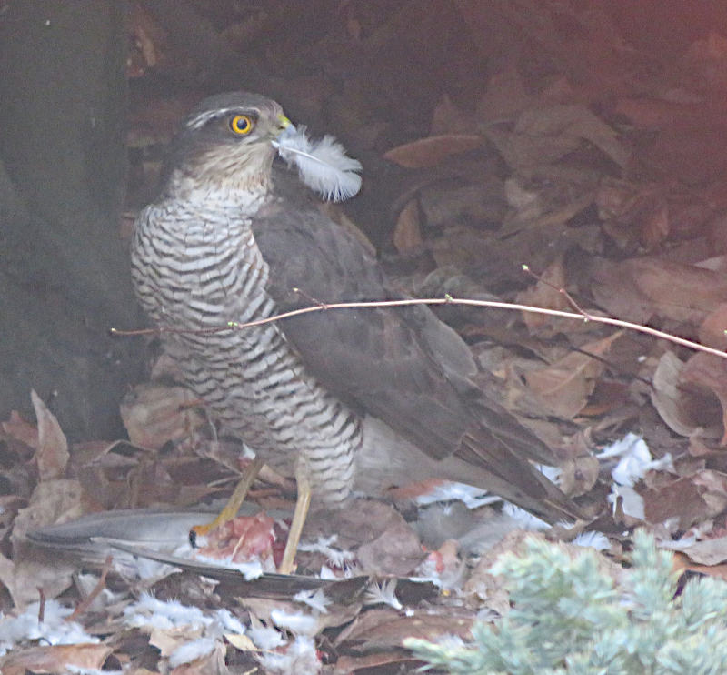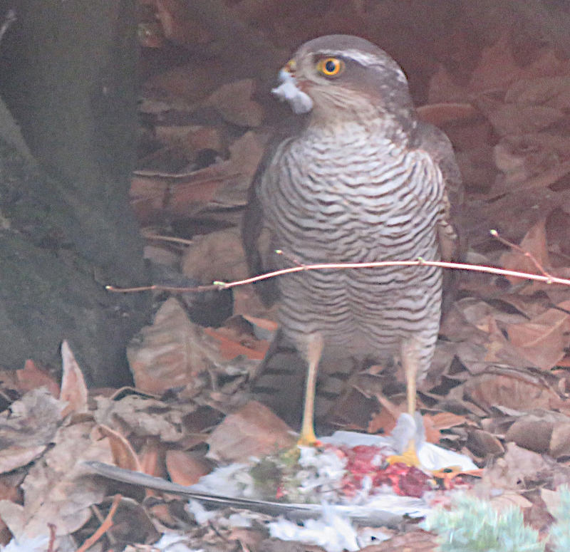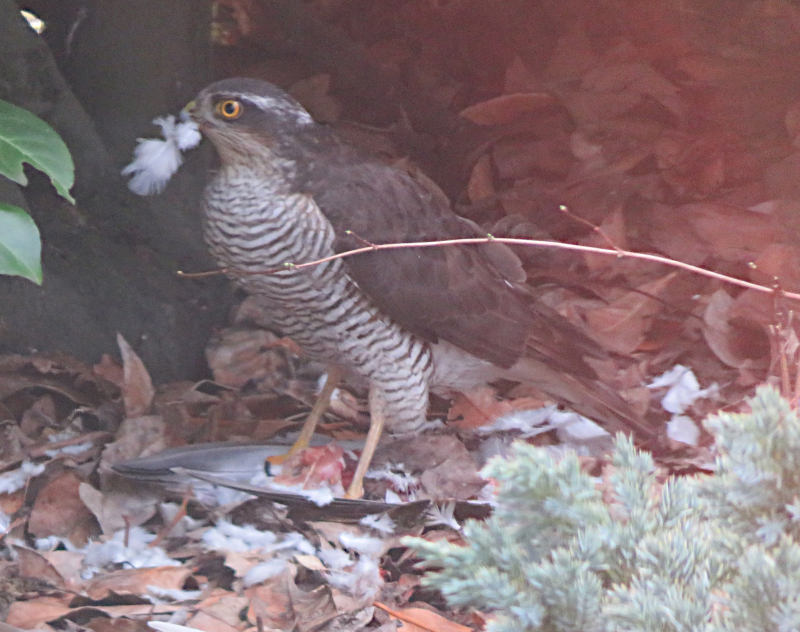 Un épervier d'Europe femelle qui avait attrapé une tourterelle turque et était en train de la manger après déplumage au sol.